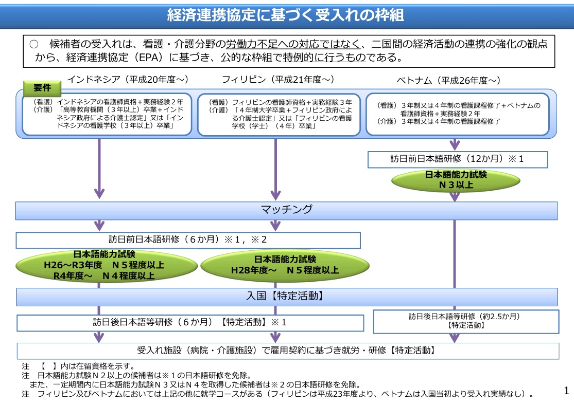 EPAは対象となっている国同士の連携強化について経済活動を通じて図る目的のものであり、介護分野においてはフィリピン・インドネシア・ベトナムとの間で受け入れを行っています。したがって「介護人材の不足を解消する」という目的の措置ではありません。なお、日本においては「国際厚生事業団(JICWELS)」が唯一の受入れ調整機関となっており、各国における候補者になるためには言語能力や技術に関する条件を満たす必要があるほか、日本語研修や業務研修なども受けなければいけません。