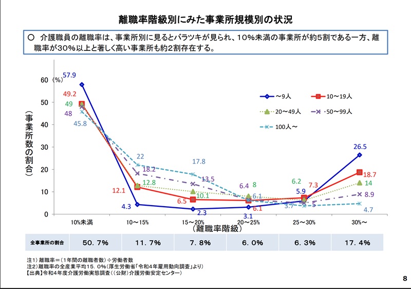 介護分野において、離職率の高さは看過できない課題です。全産業平均の離職率はおおよそ15.0%です。一方で、介護職員(2職種計)の離職率も近年改善傾向にあるものの、14〜16%台で推移しています。また、事業所別にみると、離職率30%以上の事業所が全体の約2割に上るなど、非常にばらつきの大きい状況が見られます。さらに、規模別でみると、小規模の事業所ほど離職率が高くなる傾向が確認されています。離職が多い現場では、採用・教育へのコストがかさみ、人材の定着が困難になり、外国人介護人材を含めた多様な人材確保・育成の取り組みにも大きな壁となります。早期離職を防ぎ、職場環境を整備して定着を促すことは、質の高い介護サービスを維持・向上させるために必要不可欠です。